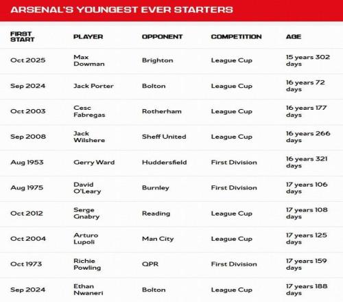 英联杯第3轮,阿森纳主场2-0击败布莱顿晋级。本场比赛,阿森纳15岁小将道曼首发出战71分钟。至此,道曼以15岁302天的年龄成为阿森纳队史最年轻的首发球员。