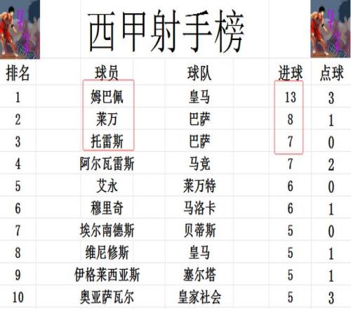 射手榜方面,姆巴佩今天未能继续进球,还是13球位列榜首。前十其他位置也没有变化,莱万8球第2,托雷斯,阿尔瓦雷斯7球并列第3,爱用和穆里奇6球并列第5。维尼修斯替补登场未能进球,还是和伊格莱西亚斯,奥亚萨瓦尔等人5球挤入前十。