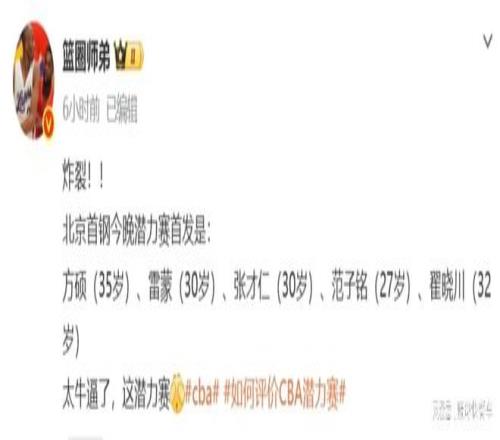 当然,相比于广厦和山西,他们还会派出几个年轻球员,北京队确实更损,他们是全员的老将,这是完全将CBA的潜力赛,当成老年赛在玩。而有了北京队带头后,在接下来的比赛,估计大部分球队也会纷纷效仿,让球队中即将退役的老将出战潜力赛,这样既可以完成篮协和CBA定下来的任务,又可以避免主力球员受伤,确实是一举两得。只不过,篮协这一次确实是被北京队这损招坑惨了。