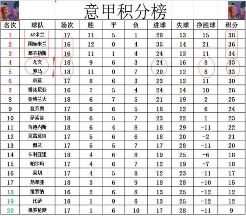 积分榜方面,AC米兰先赛赢球后,超过国米2分登顶,那不勒斯差AC米兰4分排在第3。尤文和罗马今天都有机会超过那不勒斯暂时进前3的,但是两队都无力赢球,尤文拿到1分,倒是凭借着进球优势将罗马挤出前4。