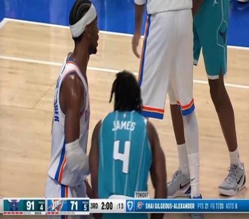 前面他连续4次出手不进之后,亚历山大又继续连打了4个,由于大比分领先,黄蜂的防守放松了,所以他打的倒是比较好。先是切入内线上篮扛着人得手,随后又是罚球线急停跳投得到两分,最后就是第3节他的最后一次进攻,亚历山大也不传球了,突到篮下单手的抛投打板命中,拿下第21分也终于完成20分的壮举。