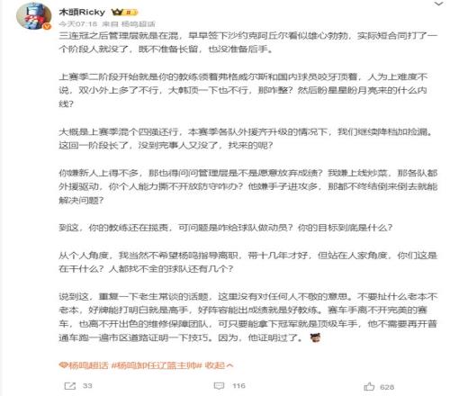 不希望杨鸣指导离职,他应该带10多年才好,他已经证明过自己的实力,有好阵容就可以夺冠。