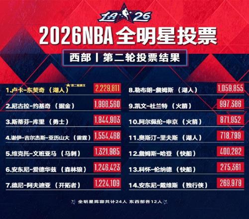 北京时间1月7日,NBA官方公布了2026年NBA全明星第二轮球迷投票结果,洛杉矶湖人后卫卢卡·东契奇与密尔沃基雄鹿前锋扬尼斯·安特托昆博,分别继续领跑西部和东部。东契奇为第二轮